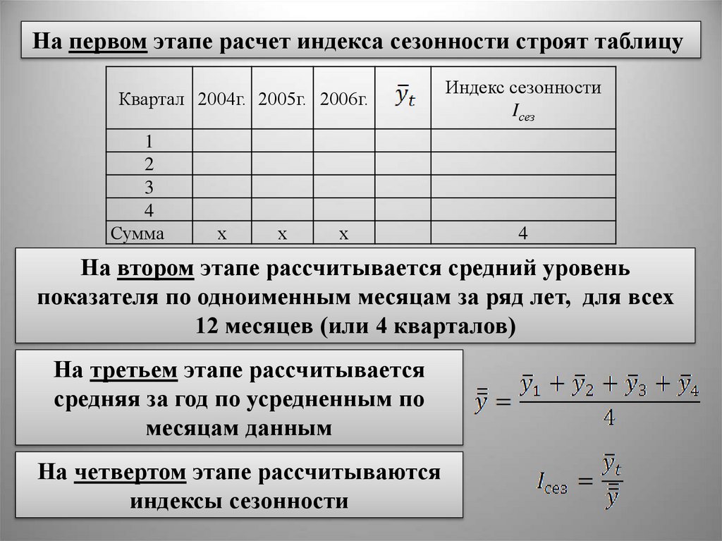 На первом этапе расчет индекса сезонности строят таблицуКвартал 2004г. 2005г. 2006г.