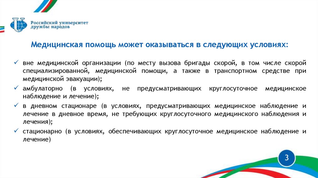 Медицинская помощь может оказываться в следующих условиях:вне медицинской организации (по месту вызова бригады скорой, в том числе скорой