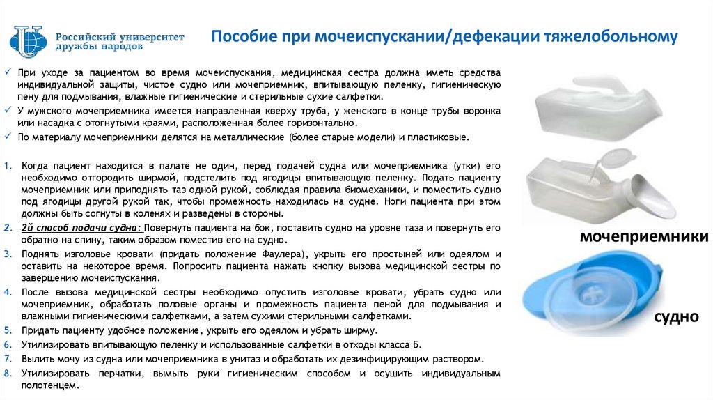 Пособие при мочеиспускании/дефекации тяжелобольномуПри уходе за пациентом во время мочеиспускания, медицинская сестра должна иметь средства
