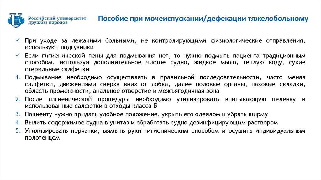Пособие при мочеиспускании/дефекации тяжелобольномуПри уходе за лежачими больными, не контролирующими физиологические отправления,