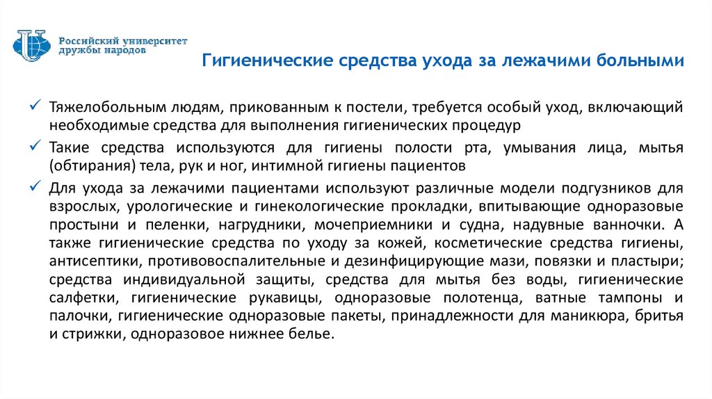 Гигиенические средства ухода за лежачими больнымиТяжелобольным людям, прикованным к постели, требуется особый уход, включающий