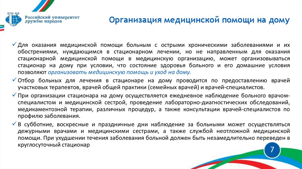 Организация медицинской помощи на домуДля оказания медицинской помощи больным с острыми хроническими заболеваниями и их
