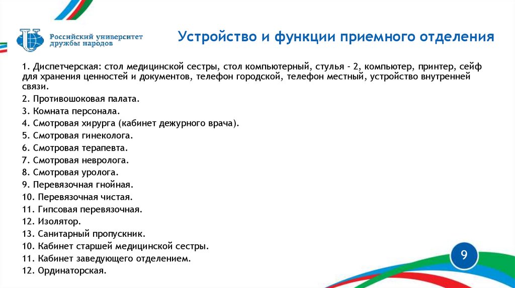 Устройство и функции приемного отделения1. Диспетчерская: стол медицинской сестры, стол компьютерный, стулья - 2, компьютер, принтер, сейф