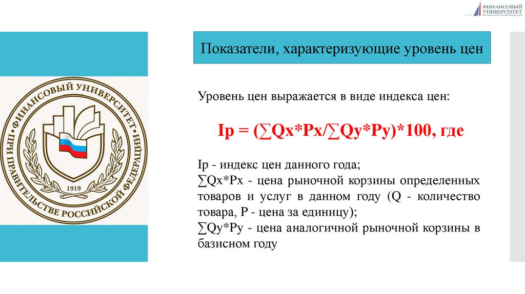 Показатели, характеризующие уровень ценУровень цен выражается в виде индекса цен: