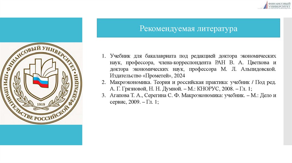 Рекомендуемая литература1. Учебник для бакалавриата под редакцией доктора экономических