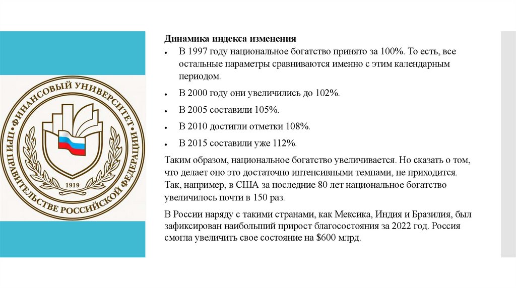 Динамика индекса измененияВ 1997 году национальное богатство принято за 100%. То есть, все