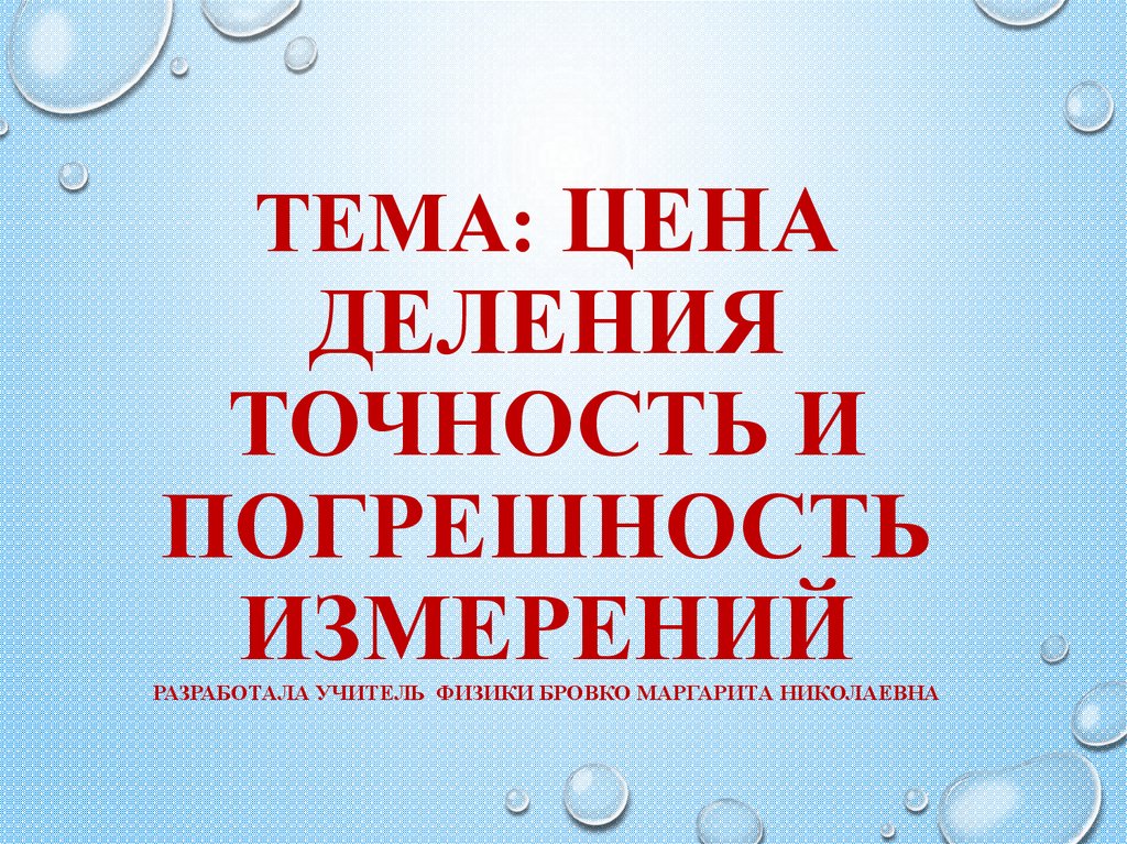 1. Тема: Цена деления Точность и погрешность измерений Разработала учитель физики Бровко Маргарита Николаевна