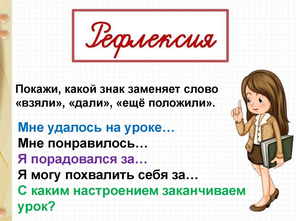 Покажи, какой знак заменяет слово«взяли», «дали», «ещё положили».