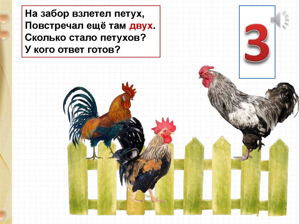 На забор взлетел петух,Повстречал ещё там двух.