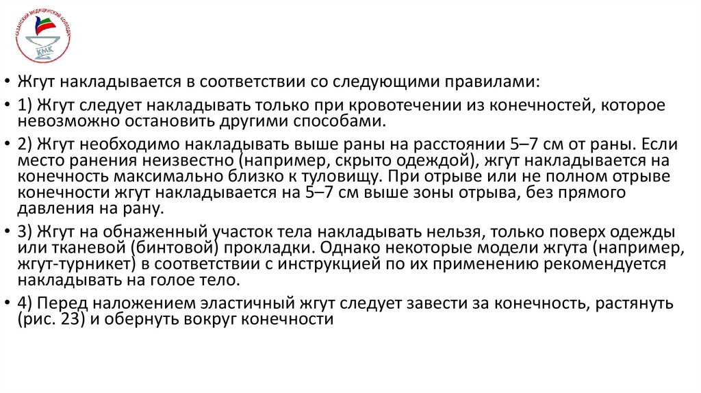 • Жгут накладывается в соответствии со следующими правилами:• 1) Жгут следует накладывать только при кровотечении из конечностей, которое