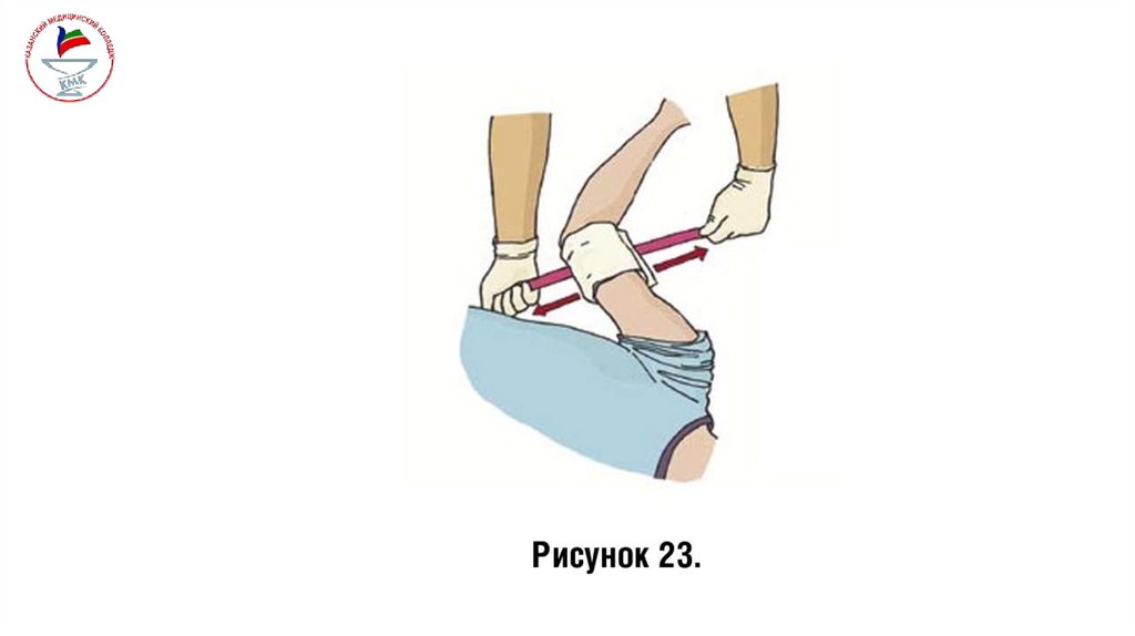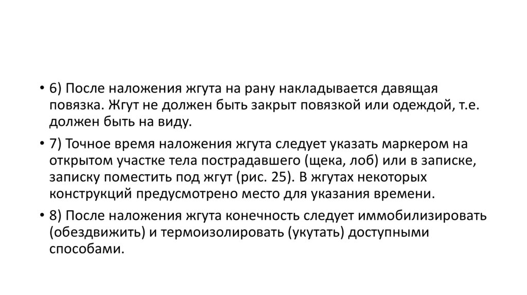 • 9) Относительно безопасный срок наложения жгута на конечностьсоставляет 2 часа, независимо от температуры окружающей среды.