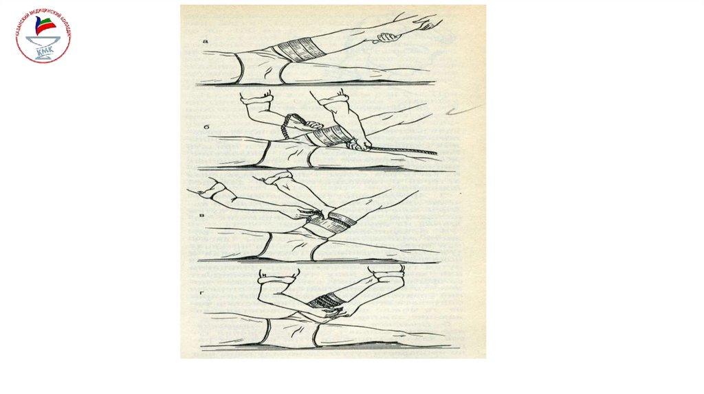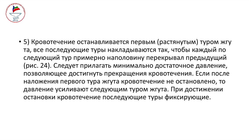 • 5) Кровотечение останавливается первым (растянутым) туром жгута, все последующие туры накладываются так, чтобы каждый по