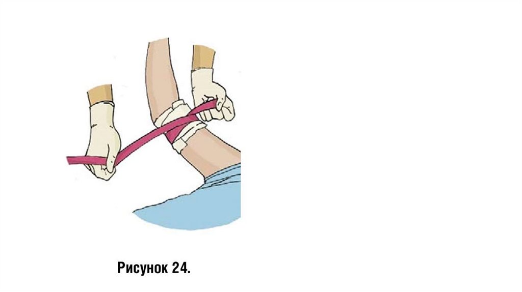 • 4) Перед наложением эластичный жгут следует завести за конечность, растянуть
