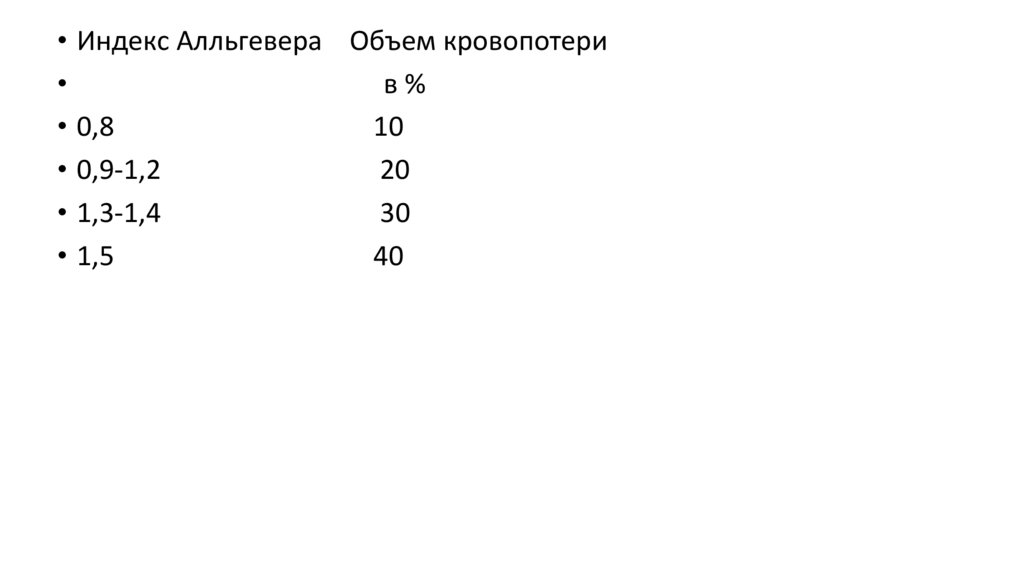 • Определение объема кровопотери основано на отношениичастоты пульса к уровню систолического АД. Нормальное