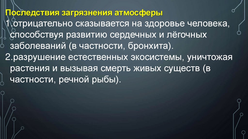 Последствия загрязнения атмосферы1.отрицательно сказывается на здоровье человека,