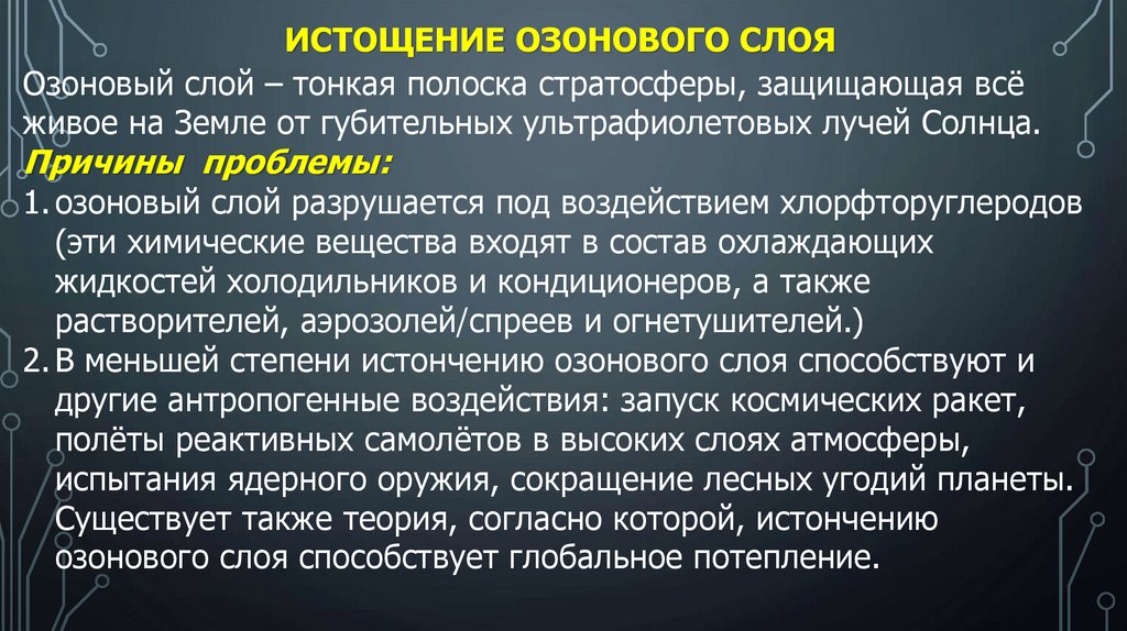 ИСТОЩЕНИЕ ОЗОНОВОГО СЛОЯОзоновый слой – тонкая полоска стратосферы, защищающая всё