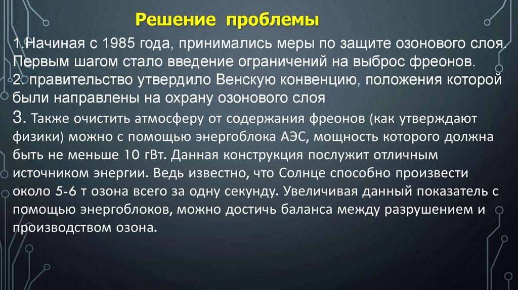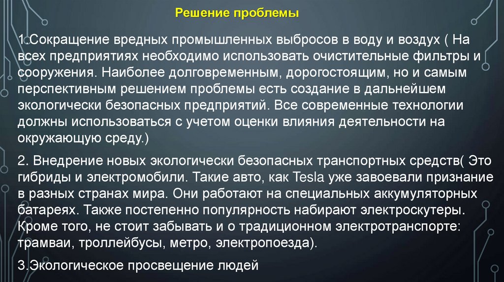 Решение проблемы1.Сокращение вредных промышленных выбросов в воду и воздух ( На