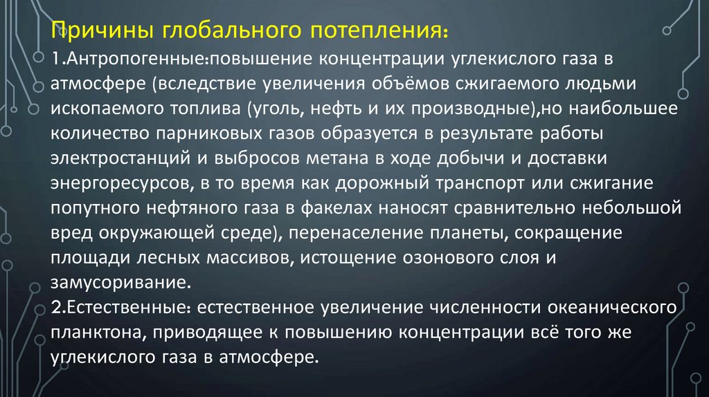Причины глобального потепления:1.Антропогенные:повышение концентрации углекислого газа в