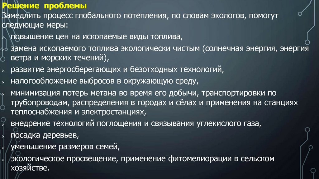 Решение проблемыЗамедлить процесс глобального потепления, по словам экологов, помогут