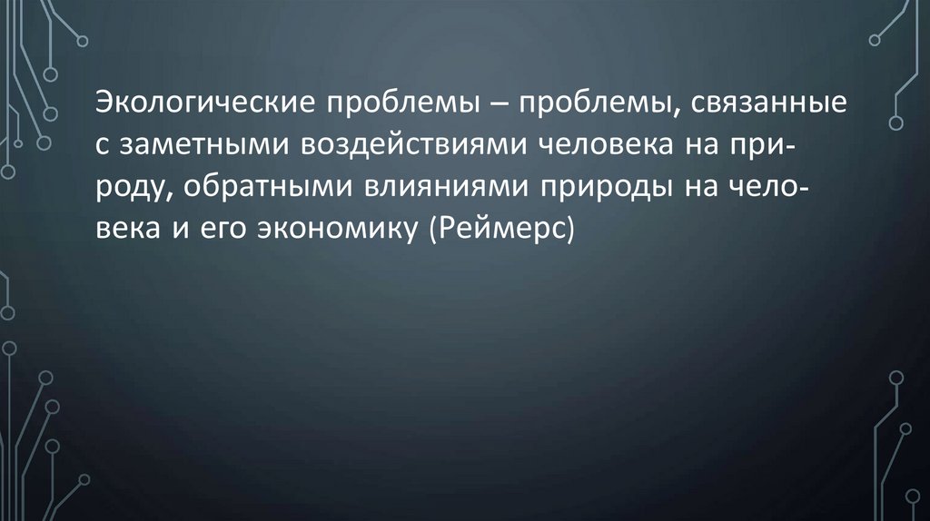 Экологические проблемы – проблемы, связанныес заметными воздействиями человека на природу, обратными влияниями природы на человека и его экономику (Реймерс)