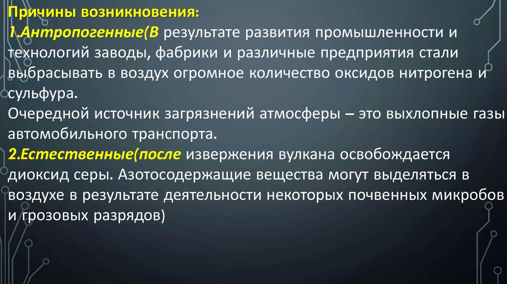 Причины возникновения:1.Антропогенные(В результате развития промышленности и