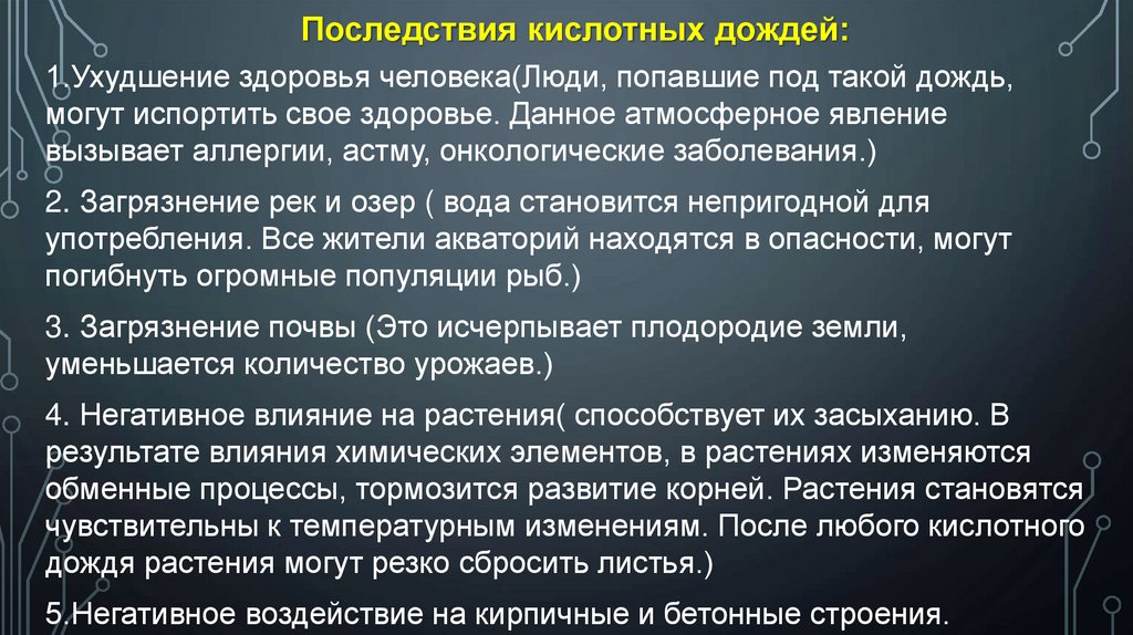 Последствия кислотных дождей:1.Ухудшение здоровья человека(Люди, попавшие под такой дождь,