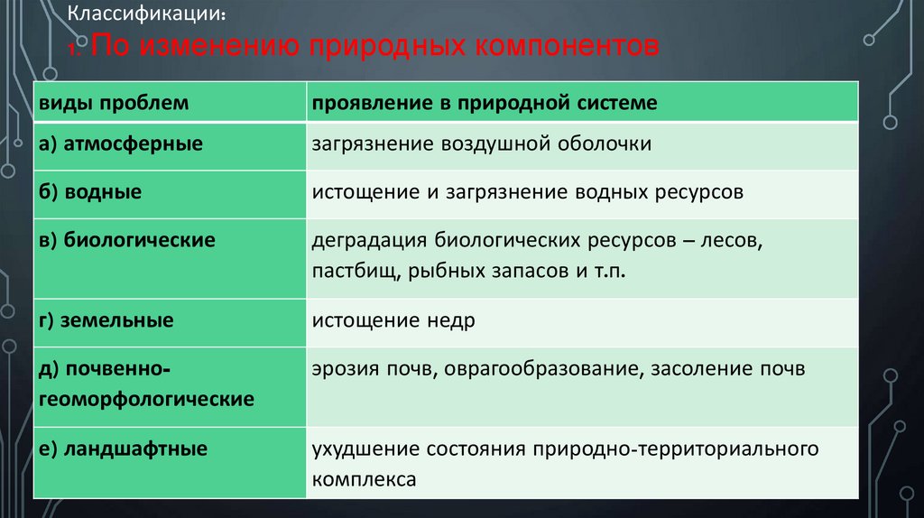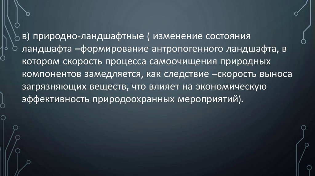 в) природно-ландшафтные ( изменение состоянияландшафта –формирование антропогенного ландшафта, в