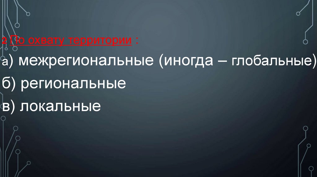 2 По охвату территории :а) межрегиональные (иногда – глобальные)