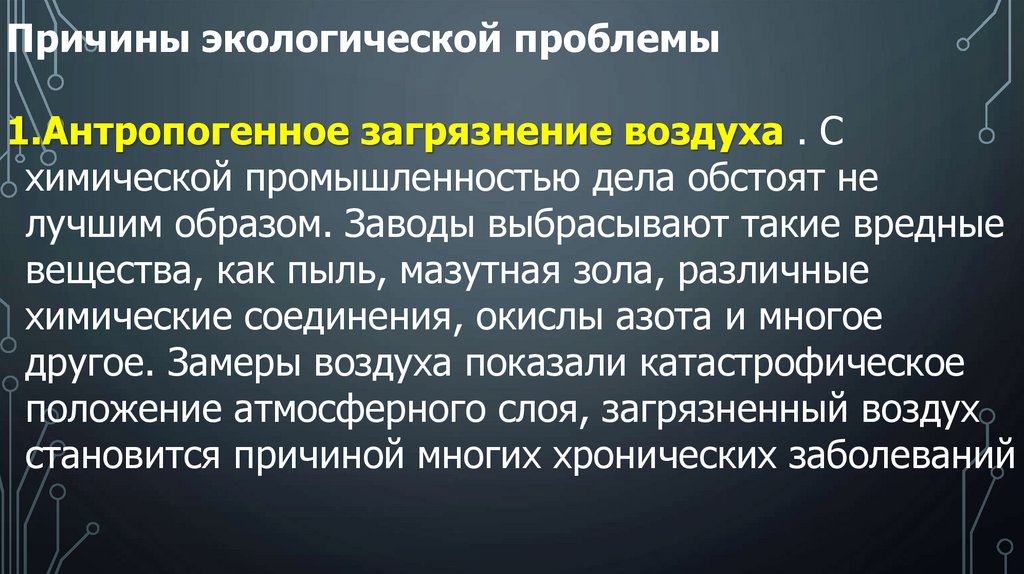 Причины экологической проблемы1.Антропогенное загрязнение воздуха . С