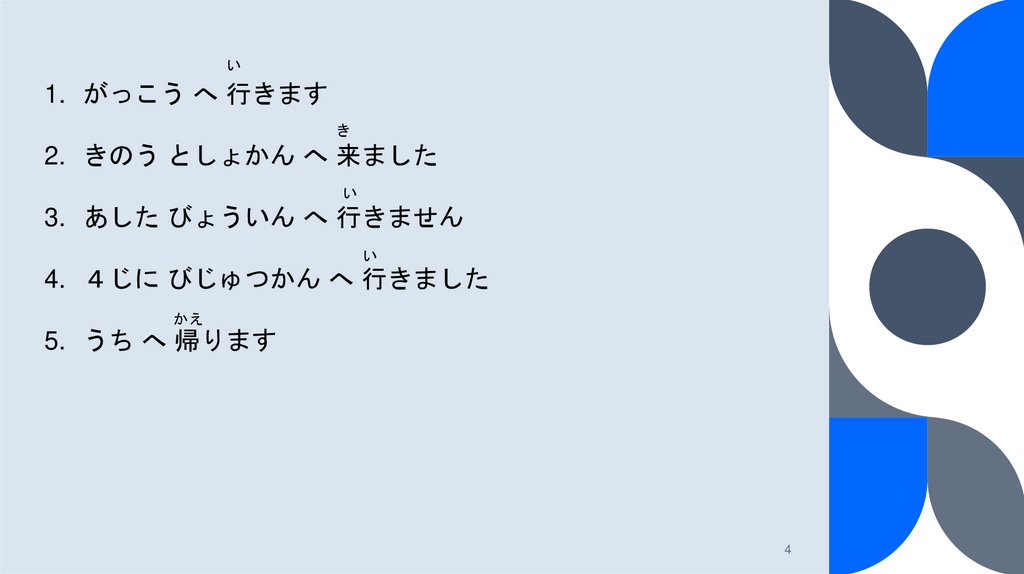 3. СУЩ(место) へ 行きます / 来ます / 帰ります