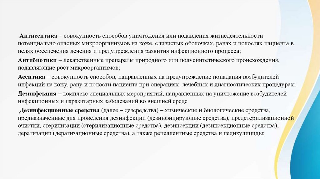 инфекций на кожу, рану и полости пациента при операциях, лечебных и диагностических процедурах;