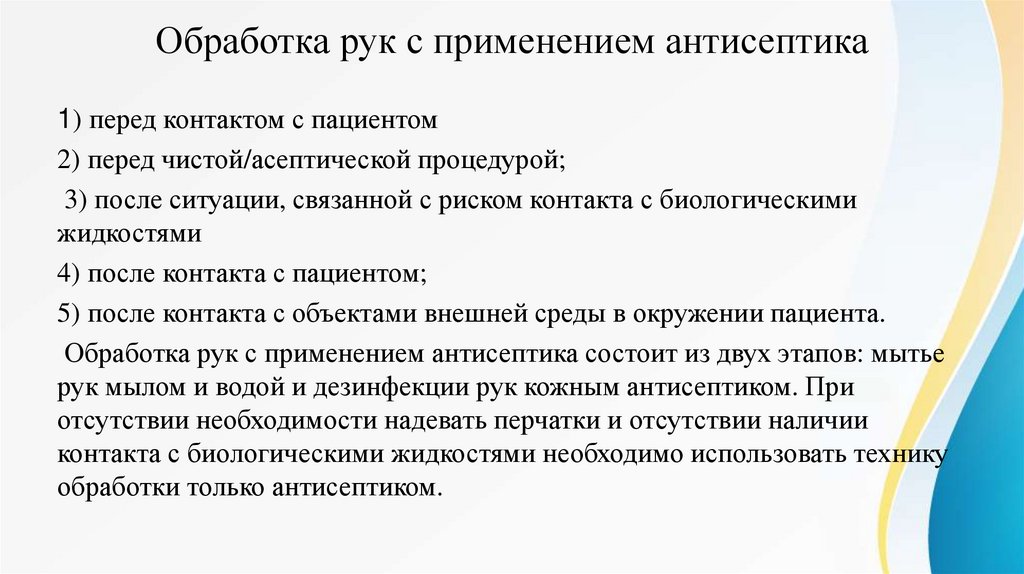 Обработка рук с применением антисептика1) перед контактом с пациентом
