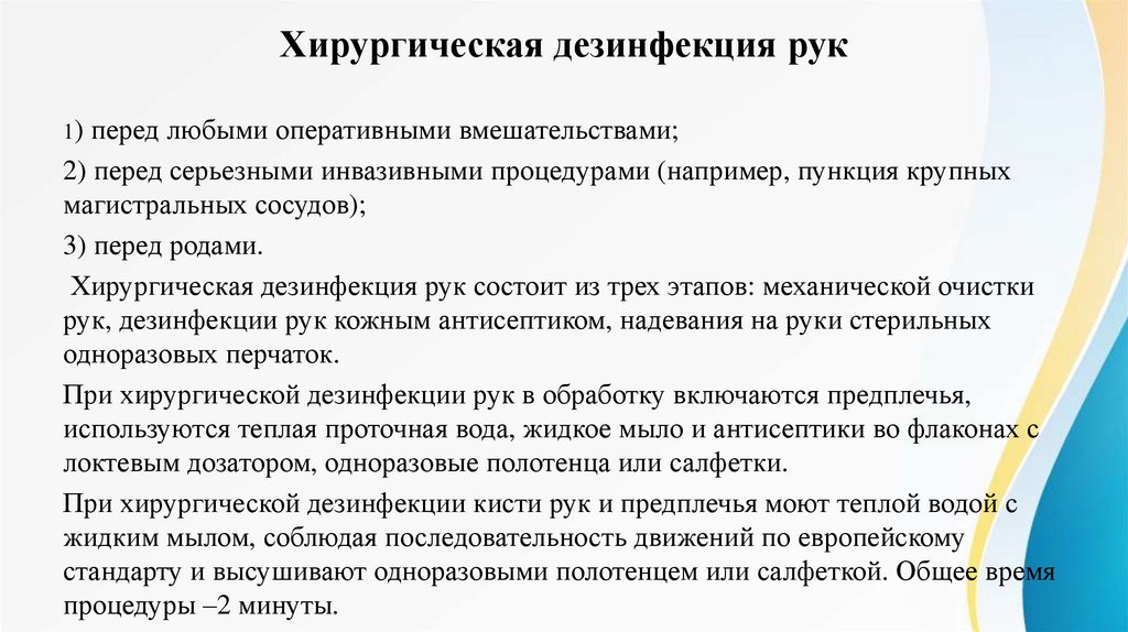 Хирургическая дезинфекция рук1) перед любыми оперативными вмешательствами;