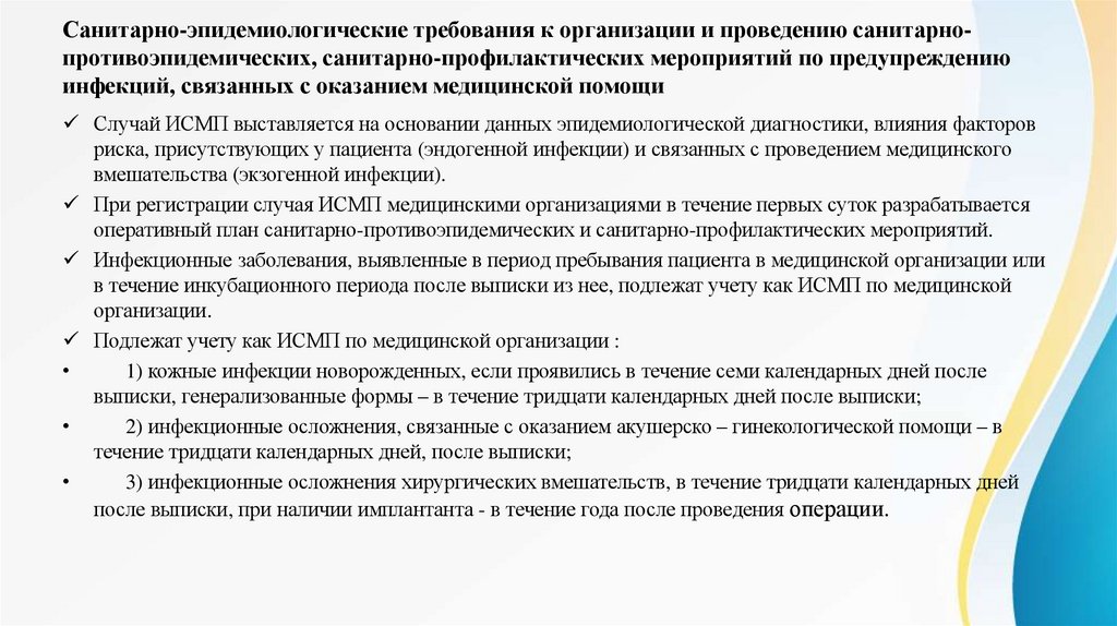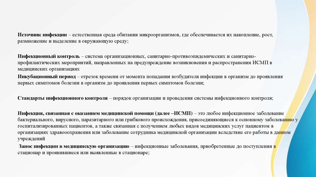 Инфекционный контроль – система организационных, санитарно-противоэпидемических и санитарнопрофилактических мероприятий, направленных на предупреждение возникновения и распространения ИСМП в