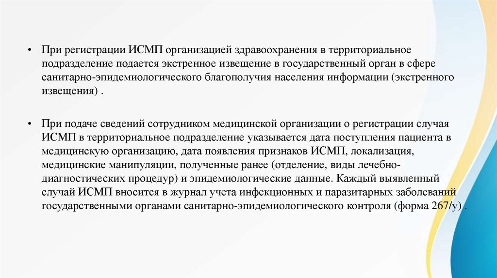 • При регистрации ИСМП организацией здравоохранения в территориальноеподразделение подается экстренное извещение в государственный орган в сфере