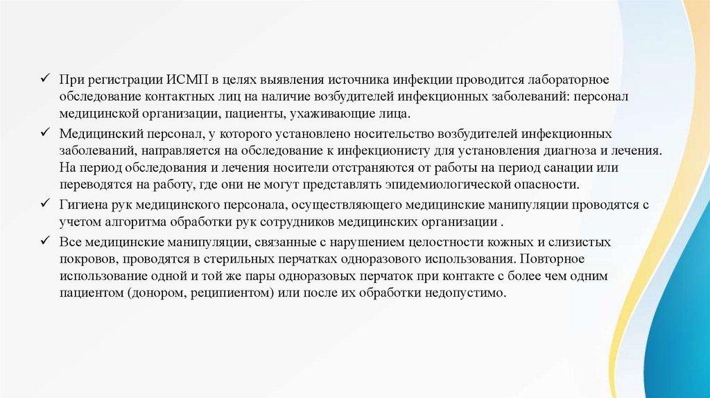 При регистрации ИСМП в целях выявления источника инфекции проводится лабораторноеобследование контактных лиц на наличие возбудителей инфекционных заболеваний: персонал