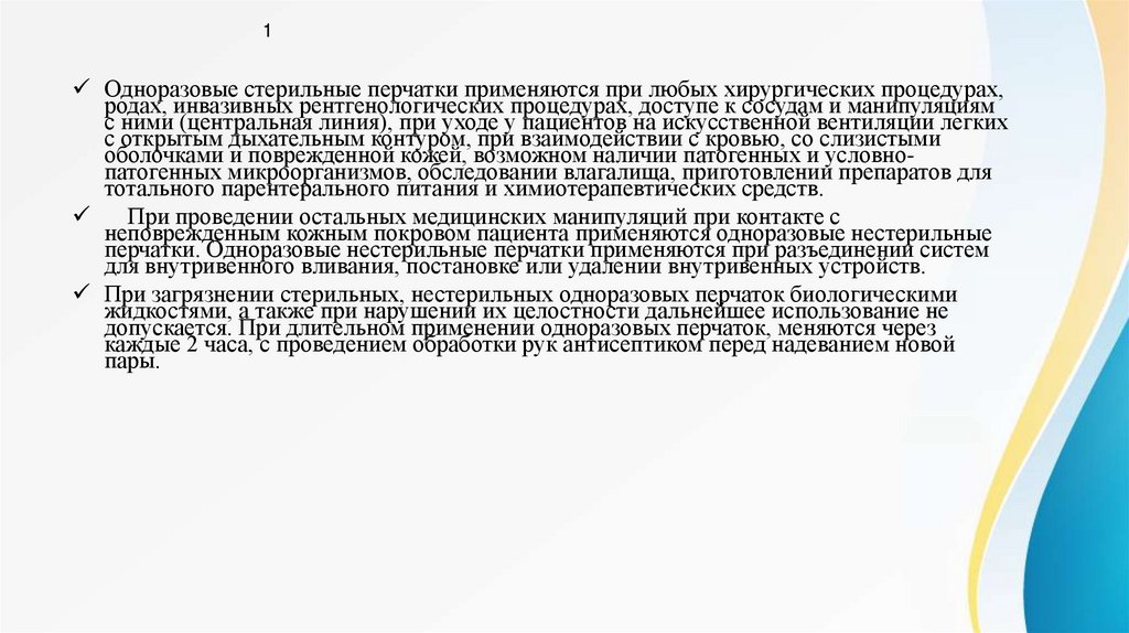 1Одноразовые стерильные перчатки применяются при любых хирургических процедурах,