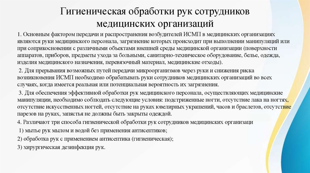 возникновения ИСМП необходимо обрабатывать руки сотрудников медицинских организаций во всех