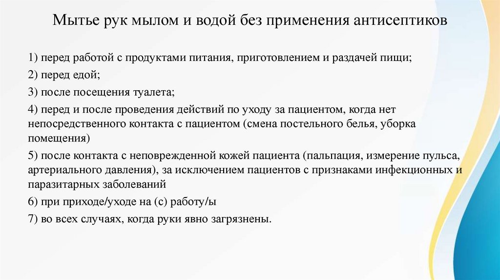 Мытье рук мылом и водой без применения антисептиков1) перед работой с продуктами питания, приготовлением и раздачей пищи;