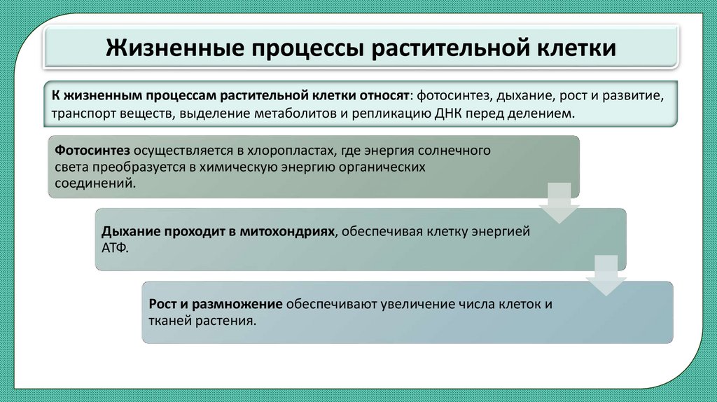 Жизненные процессы растительной клеткиК жизненным процессам растительной клетки относят: фотосинтез, дыхание, рост и развитие,