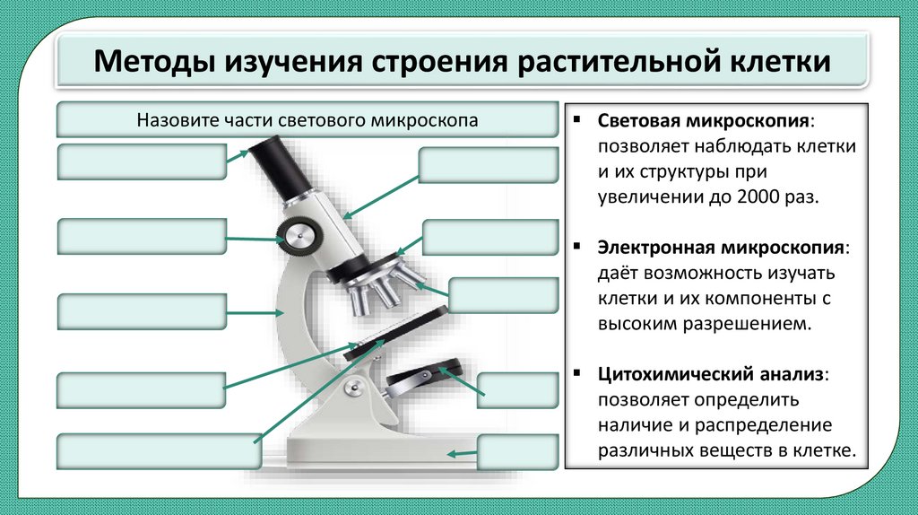 Методы изучения строения растительной клеткиНазовите части светового микроскопа