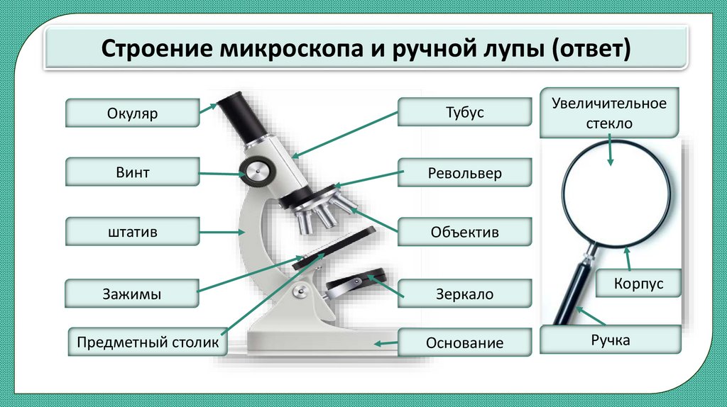 Строение микроскопа и ручной лупы (ответ)Окуляр