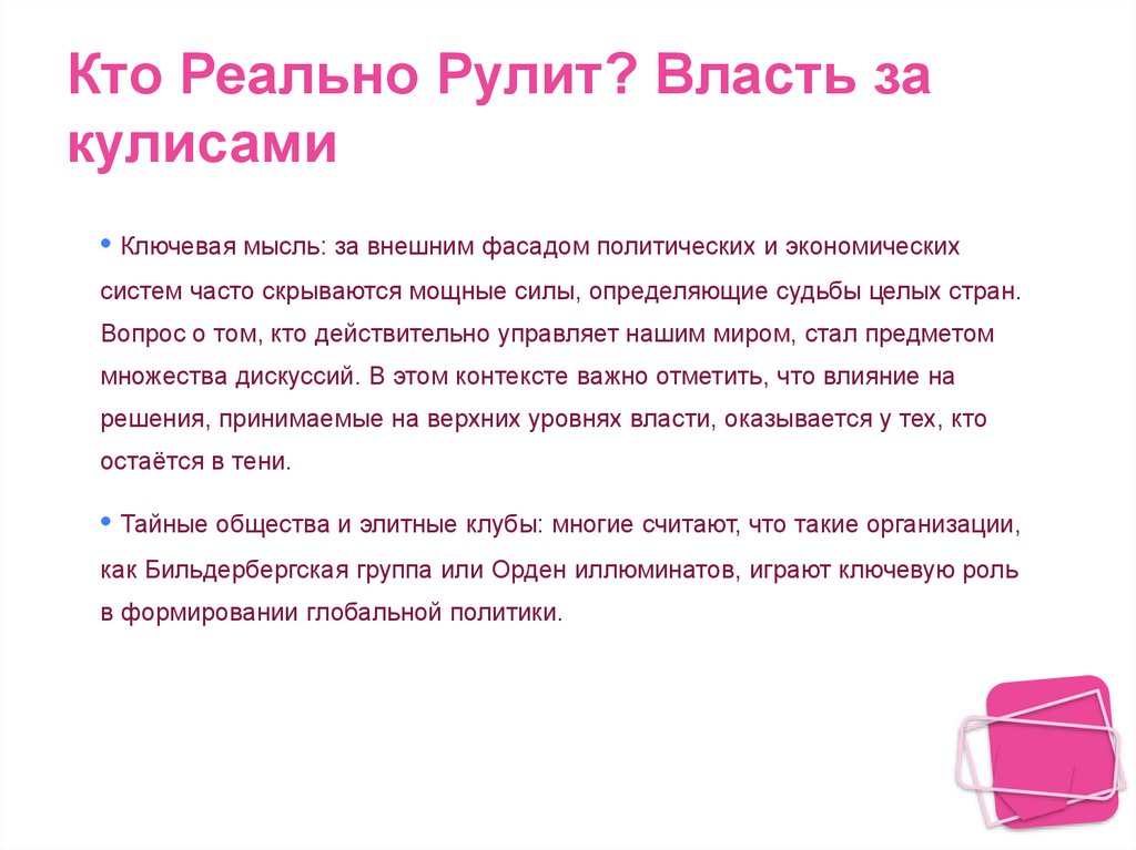 как Бильдербергская группа или Орден иллюминатов, играют ключевую роль