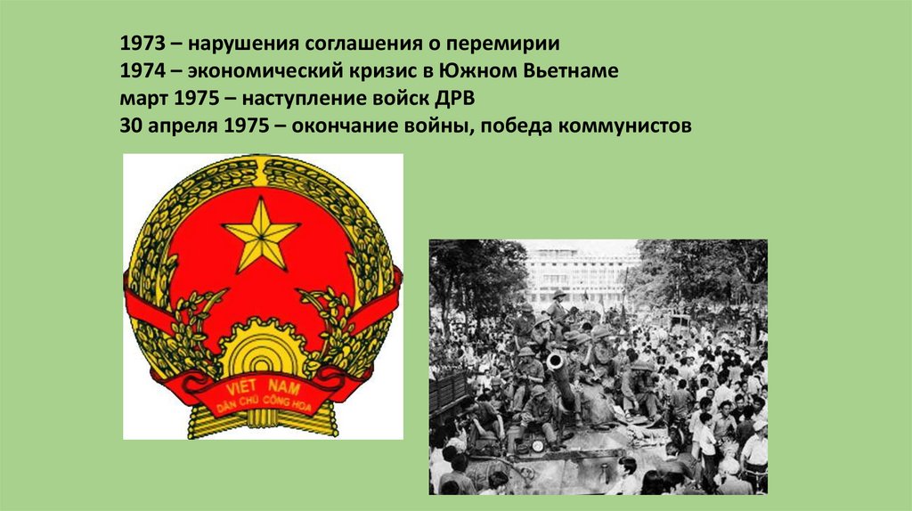 1973 – нарушения соглашения о перемирии1974 – экономический кризис в Южном Вьетнаме