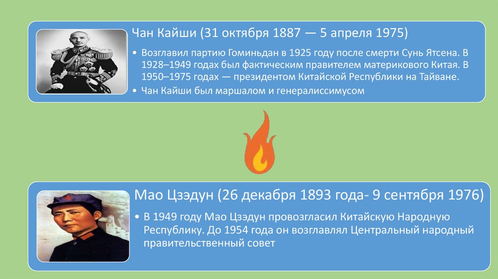 Чан Кайши (31 октября 1887 — 5 апреля 1975)• Возглавил партию Гоминьдан в 1925 году после смерти Сунь Ятсена. В