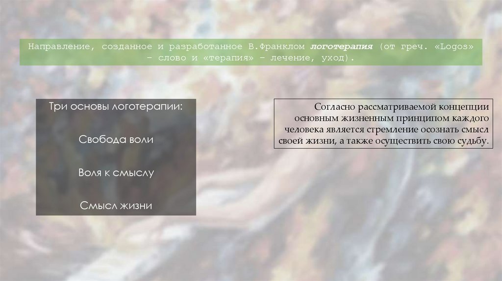 Направление, созданное и разработанное В.Франклом логотерапия (от греч. «Logos»– слово и «терапия» – лечение, уход).