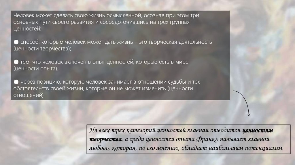 Человек может сделать свою жизнь осмысленной, осознав при этом триосновных пути своего развития и сосредоточившись на трех группах