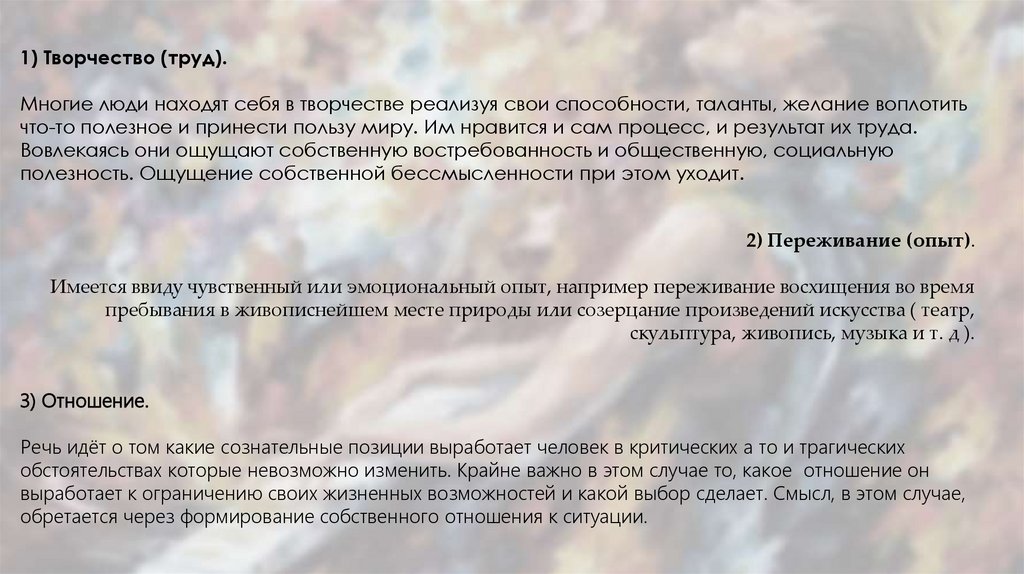 1) Творчество (труд).Многие люди находят себя в творчестве реализуя свои способности, таланты, желание воплотить