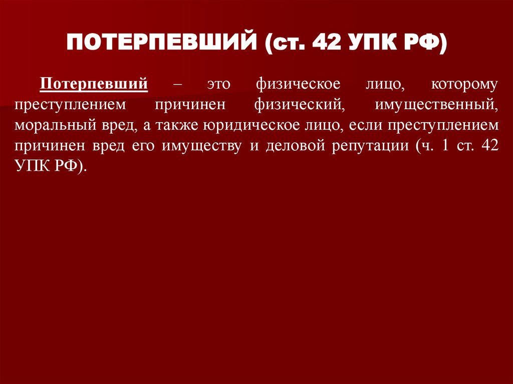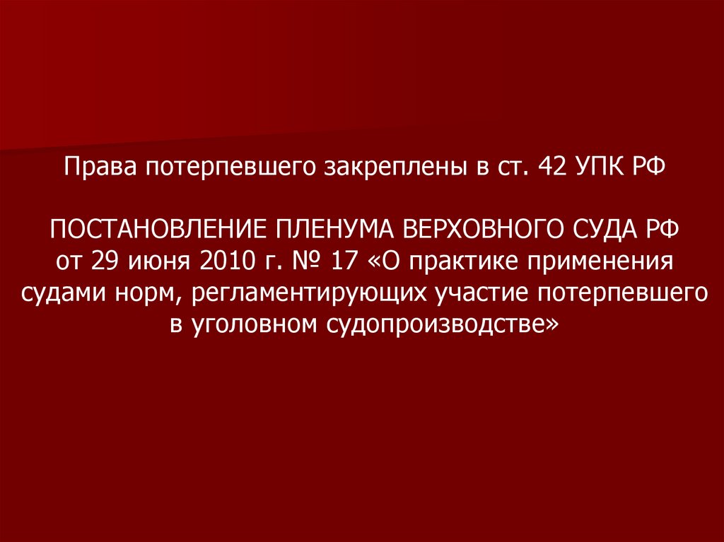 Права потерпевшего закреплены в ст. 42 УПК РФПОСТАНОВЛЕНИЕ ПЛЕНУМА ВЕРХОВНОГО СУДА РФ