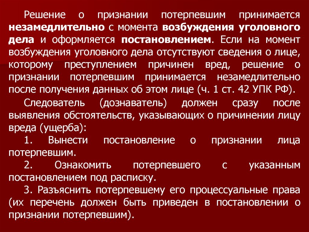 Решение о признании потерпевшим принимаетсянезамедлительно с момента возбуждения уголовного